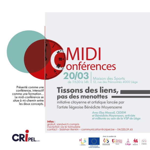 « Tissons des liens. Pas des menottes. » sera installé au sein du Festival Jam’in Jette ce 16 et 17 mai 2025. L’objectif est d’interpeller les citoyennes et les citoyens durant un événement culturel dans l’espace public. L’entièreté de l’œuvre ne sera pas déployée mais elle sera suffisante pour permettre de se faire une idée. Au plaisir de vous y rencontrer.